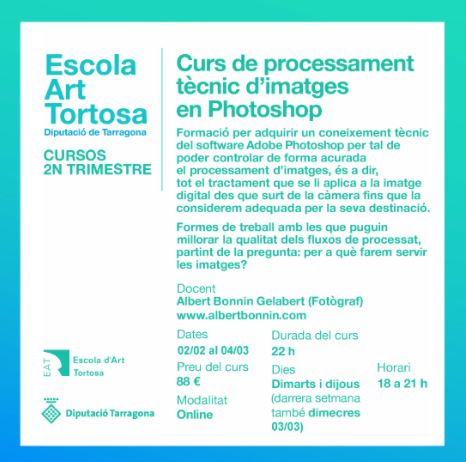 L'Escola d'Art de la Diputació a Tortosa ofereix el curs en línia de processament tècnic d'imatges en Photoshop que tindrà lloc del 2 de febrer al 4 de març del 2021 amb una durada de 22h i un preu de 88 euros. La matrícula és oberta! Podeu trucar al 977 44 41 63 o enviar un missatge a eatortosa@dipta.cat