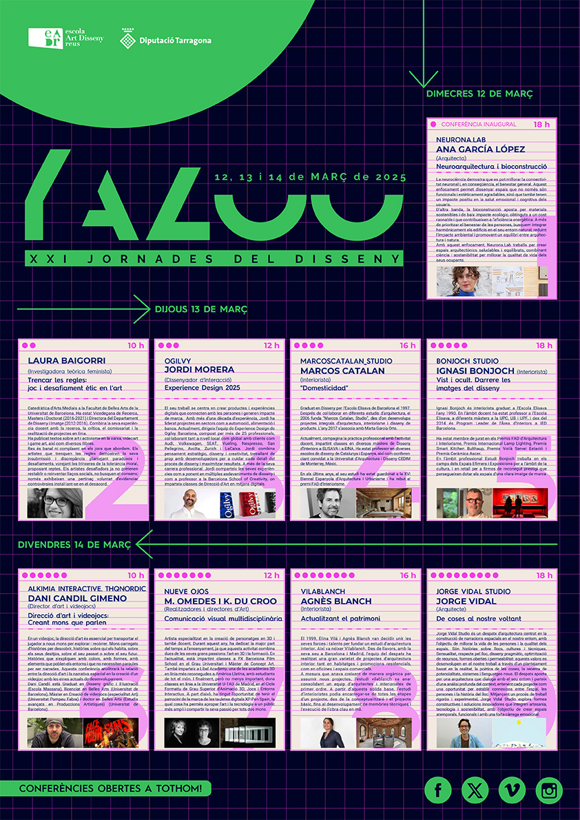Un any més tindran lloc les XXI Jornades del disseny. Les Jornades Yazoo responen a la doble vocació de la nostra escola, de formar l'alumnat i de dotar-los d'eines per a la formació continuada mitjançant propostes teòriques i experiències de professionals de reconeguda trajectòria. Any rere any aquesta trobada agafa més revolada i cada vegada més, públic d'altres escoles i col·lectius s'uneixen a aquesta iniciativa; les jornades Yazoo s'obren així a tot el públic amb la voluntat de fer extensiva l'activitat i el coneixement que genera l'escola a tota la ciutadania. 9 conferències en 3 dies! no us les perdeu.