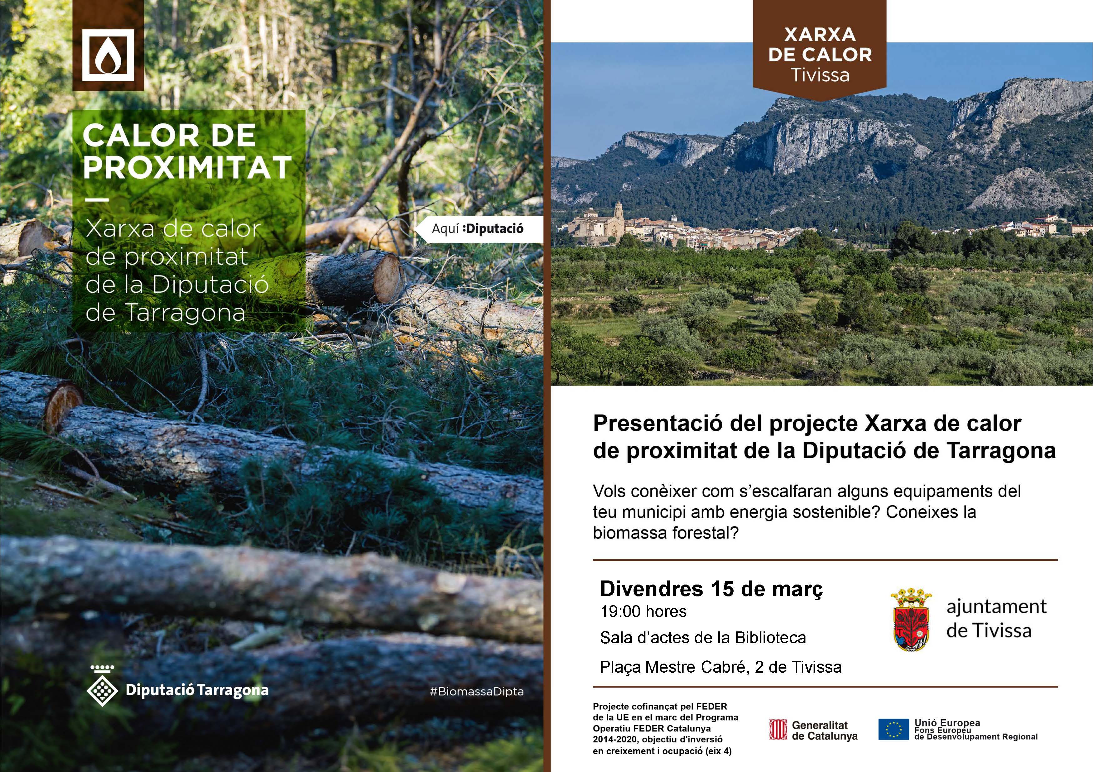 La sala d’actes de la Biblioteca de Tivissa acollirà, el proper divendres 15 de març, a les 19.00 h , la presentació de la iniciativa 'Xarxa de Calor de Proximitat de la Diputació de Tarragona', que contempla la instal·lació de calderes i xarxes de calor en edificis municipals per produir energia tèrmica a partir de la biomassa (estelles de fusta, procedents de boscos).