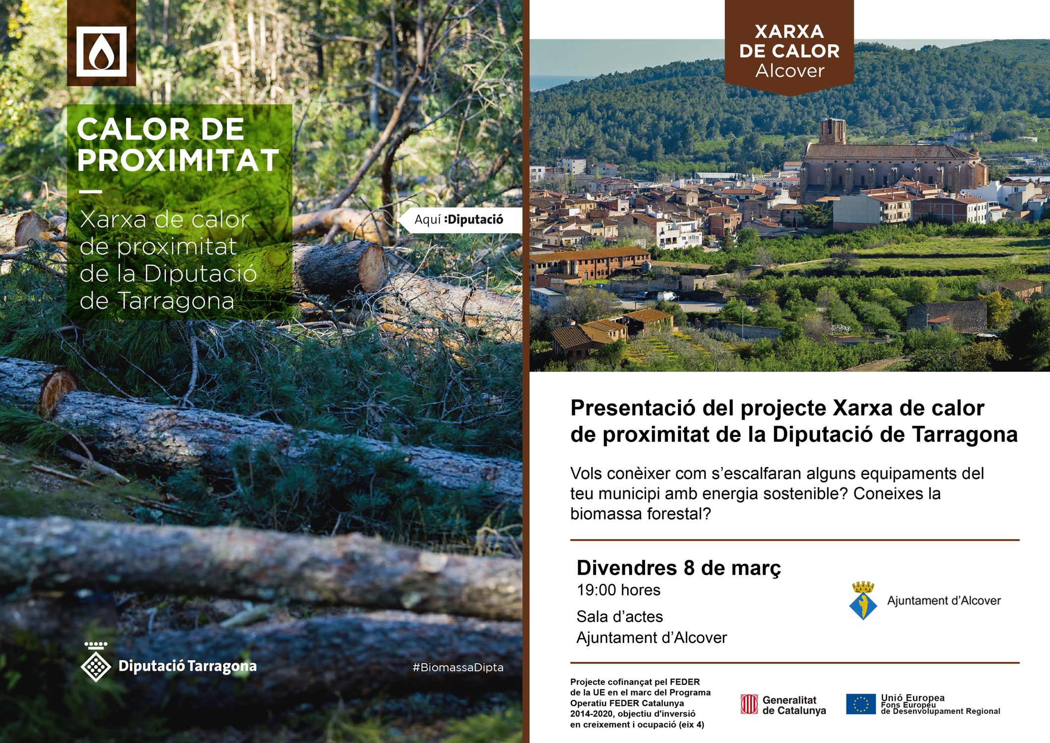 La sala d’actes de l’Ajuntament d’Alcover acollirà, el proper 8 de març, a les 19.00h , la presentació de la iniciativa 'Xarxa de Calor de Proximitat de la Diputació de Tarragona', que contempla la instal·lació de calderes i xarxes de calor en edificis municipals per produir energia tèrmica a partir de la biomassa (estelles de fusta, procedents de boscos).