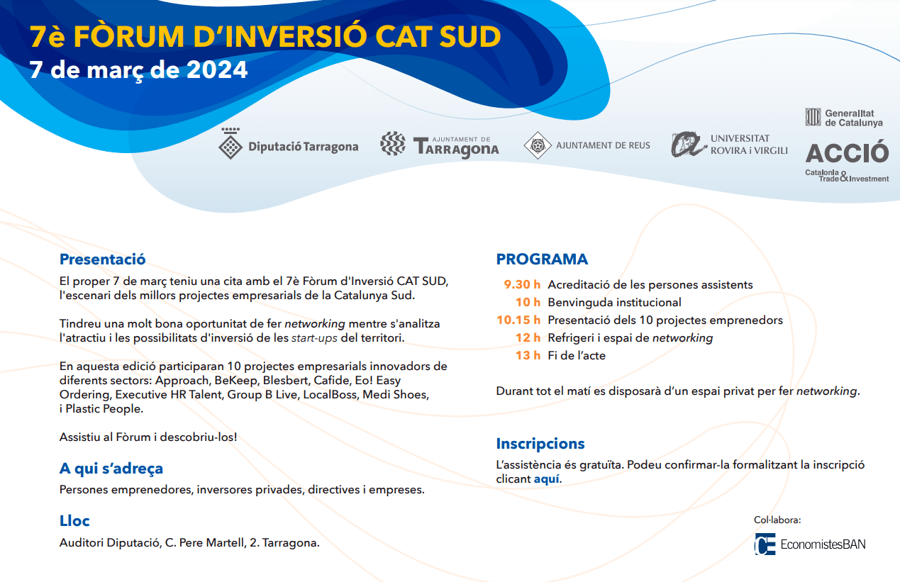 La Diputació de Tarragona, l’Ajuntament de Tarragona, l’Ajuntament de Reus, ACCIO –l’Agència per a la competitivitat de l'empresa de la Generalitat de Catalunya– i la Universitat Rovira i Virgili, a través de la Càtedra d’Emprenedoria, convoquen el 7è Fòrum d’inversió CAT SUD adreçat a persones emprenedores i inversores del Camp de Tarragona, les Terres de l’Ebre i el Baix Penedès.