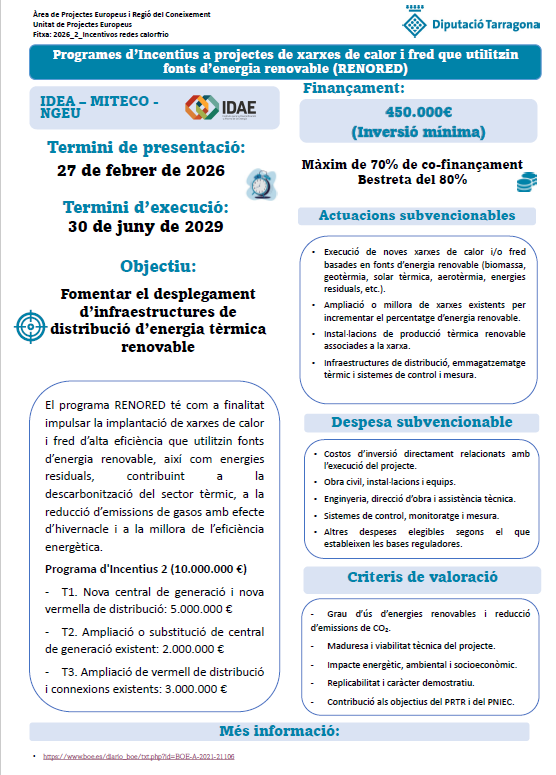 El programa RENORED té com a finalitat impulsar la implantació de xarxes de calor i fred d’alta eficiència que utilitzin fonts d’energia renovable, així com energies residuals, contribuint a la descarbonització del sector tèrmic, a la reducció d’emissions de gasos amb efecte d’hivernacle i a la millora de l’eficiència energètica.