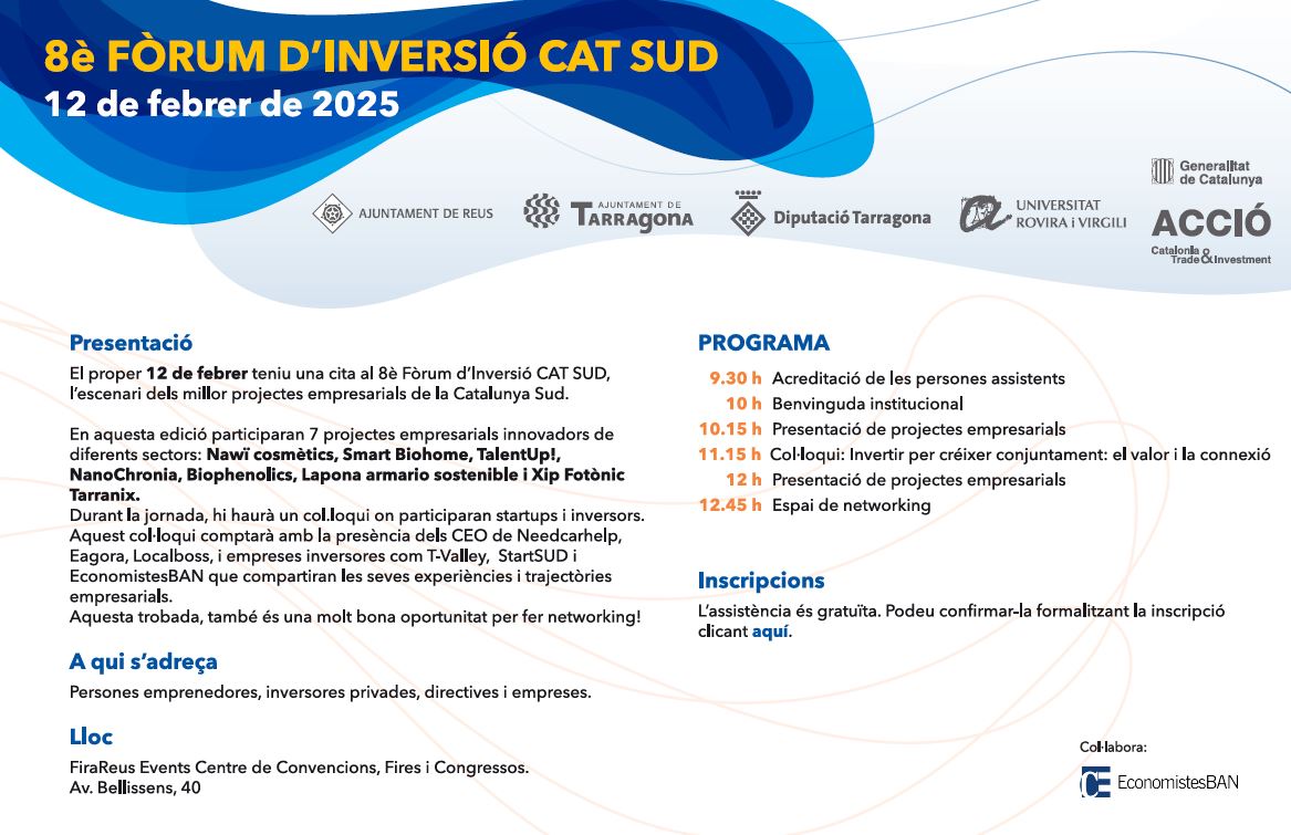 El 8è Fòrum d'Inversió CAT SUD tindrà lloc el pròxim 12 de febrer de 2025 a FiraReus Events Centre de Convencions, a la capital del Baix Camp, en una nova oportunitat de trobada entre persones emprenedores que cerquen finançament per als seus projectes empresarials, així com possibles inversors.
