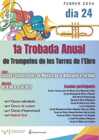 L’Escola i Conservatori de Música de la Diputació a Tortosa organitza aquest dissabte 24 de febrer la I Trobada Anual de Trompetes de les Terres de l’Ebre amb l’objectiu de compartir experiències i crear sinèrgies entre alumnat i professorat de diferents escoles de música de les Terres de l’Ebre. Una trobada en què participaran una cinquantena de trompetistes d’entre 7 i 67 anys vinguts d’onze municipis ebrencs i també de l’Escola i Conservatori de Música de la Diputació a Reus.
