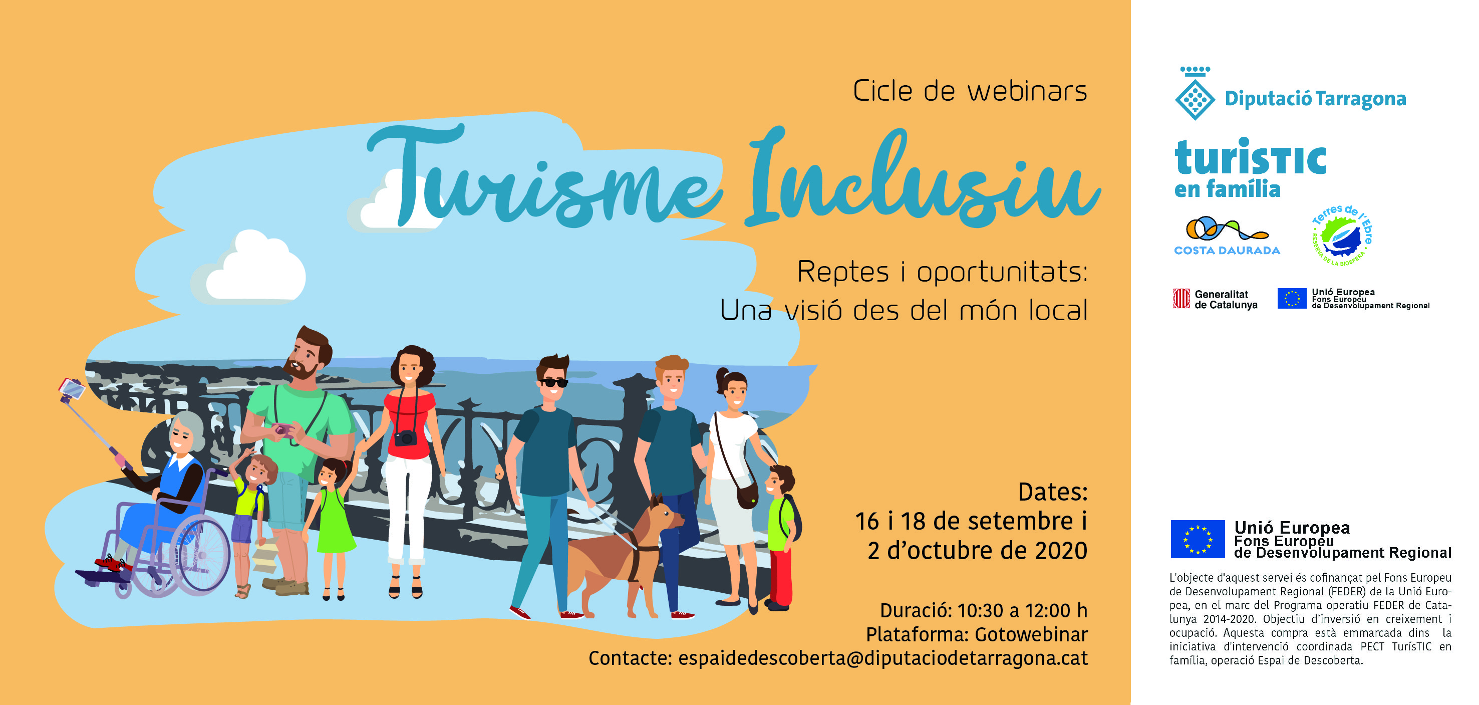 L’Operació Espai de Descoberta del projecte PECT TurisTIC en Família, liderada per la Diputació de Tarragona, reprén el cicle de trobades virtuals sobre Turisme inclusiu amb dues noves sessions adreçades a empreses turístiques. Les jornades tindran lloc el 16 i 18 de setembre i comptaran amb experts i professionals del sector que exposaran les noves tendències de mercat, les demandes i les oportunitats que suposa el turisme inclusiu per al sector privat.