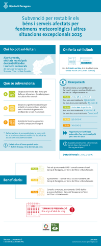 Les subvencions destinades a restablir béns i serveis dels municipis afectats per fenòmens meteorològics i altres situacions excepcionals contribueixen a sufragar d’una banda, despeses derivades de danys produïts per alteracions climatològiques i/o catàstrofes naturals (com ara inundacions causades per la pluja o desperfectes causats pel vent o les pedregades, per exemple); de l’altra, despeses d’inversió i altres actuacions urgents i necessàries per restablir els serveis i béns afectats (abastament d’aigua potable i clavegueram, enllumenat públic, pavimentació de vies, equipaments municipals, etc.) i finalment, també permeten costejar l’assistència tècnica, econòmica o jurídica de caràcter excepcional i urgent. Els fets han d’haver ocorregut entre l’1 d’abril del 2024 i el 31 de març del 2025. El termini per presentar la sol·licitud finalitza el proper 30 d’abril.