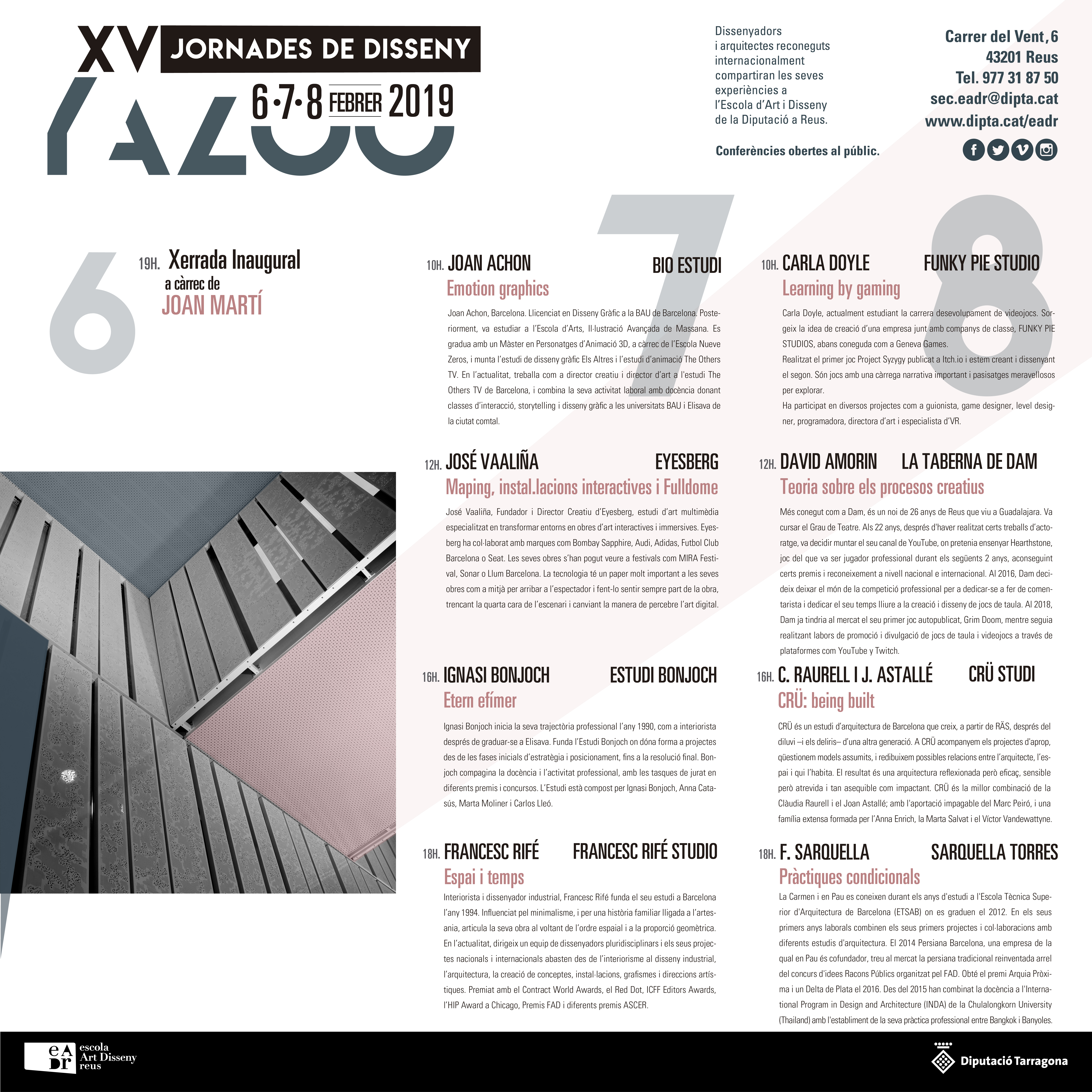 L’Escola d’Art i Disseny de la Diputació de Tarragona a Reus celebra del 6 al 8 de febrer les XV Jornades de Disseny Yazoo, amb conferències obertes al públic a càrrec de dissenyadors i arquitectes reconeguts internacionalment. Aquesta activitat, que fins ara s’havia centrat en el disseny d’interiors, amplia enguany la temàtica al món del disseny audiovisual.