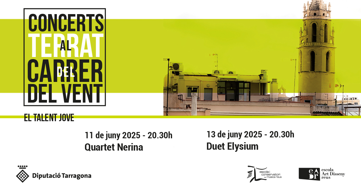 Nova edició del cicle ‘Concerts al Terrat’ organitzat per l’Escola i Conservatori de Música de la Diputació a Reus. Un any més, el terrat de l’edifici de la Diputació al carrer del Vent es converteix en l’escenari especial i únic per a dos concerts de música de cambra. Una proposta cultural amb un paisatge urbà singular, on destaca la Prioral de Sant Pere.