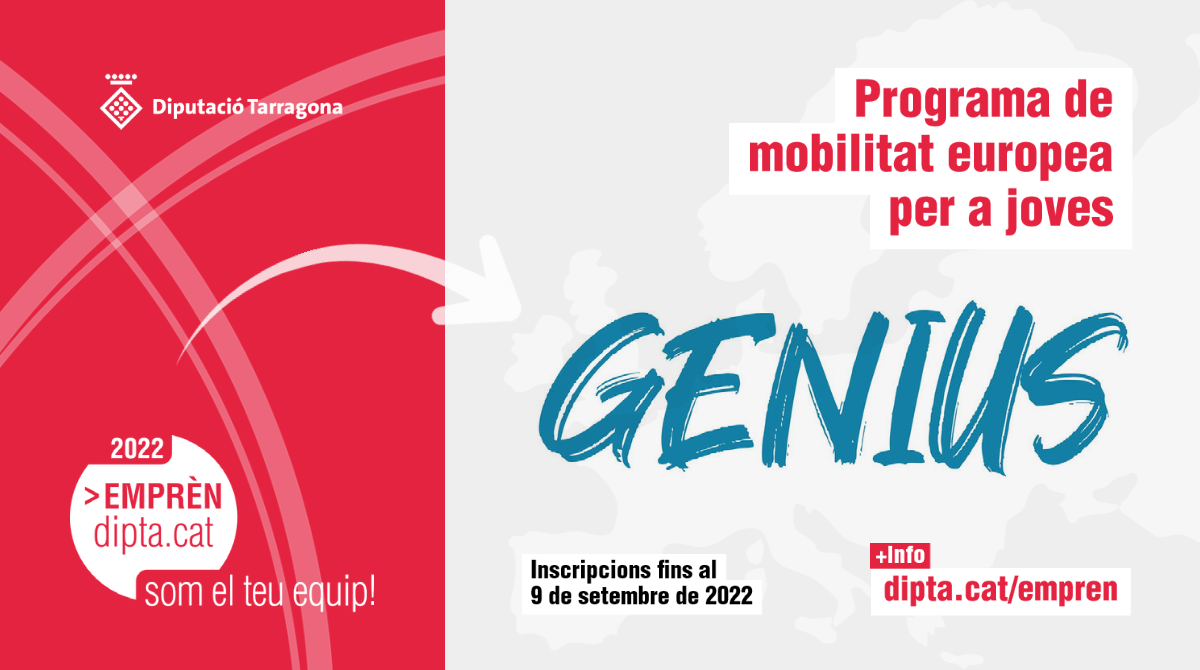 La Diputació de Tarragona posa en marxa una nova edició del programa d’ajuts Genius, que ofereix noves oportunitats als joves amb titulació superior que actualment estan aturats. Les beques, dotades amb 9.300€ per a cadascun dels 10 participants, promouen la realització d’estades professionals a l’estranger, en entitats o institucions vinculades a la Unió Europea i després a la demarcació de Tarragona. El termini de presentació de sol·licituds estarà obert fins al dia 9 de setembre de 2022.