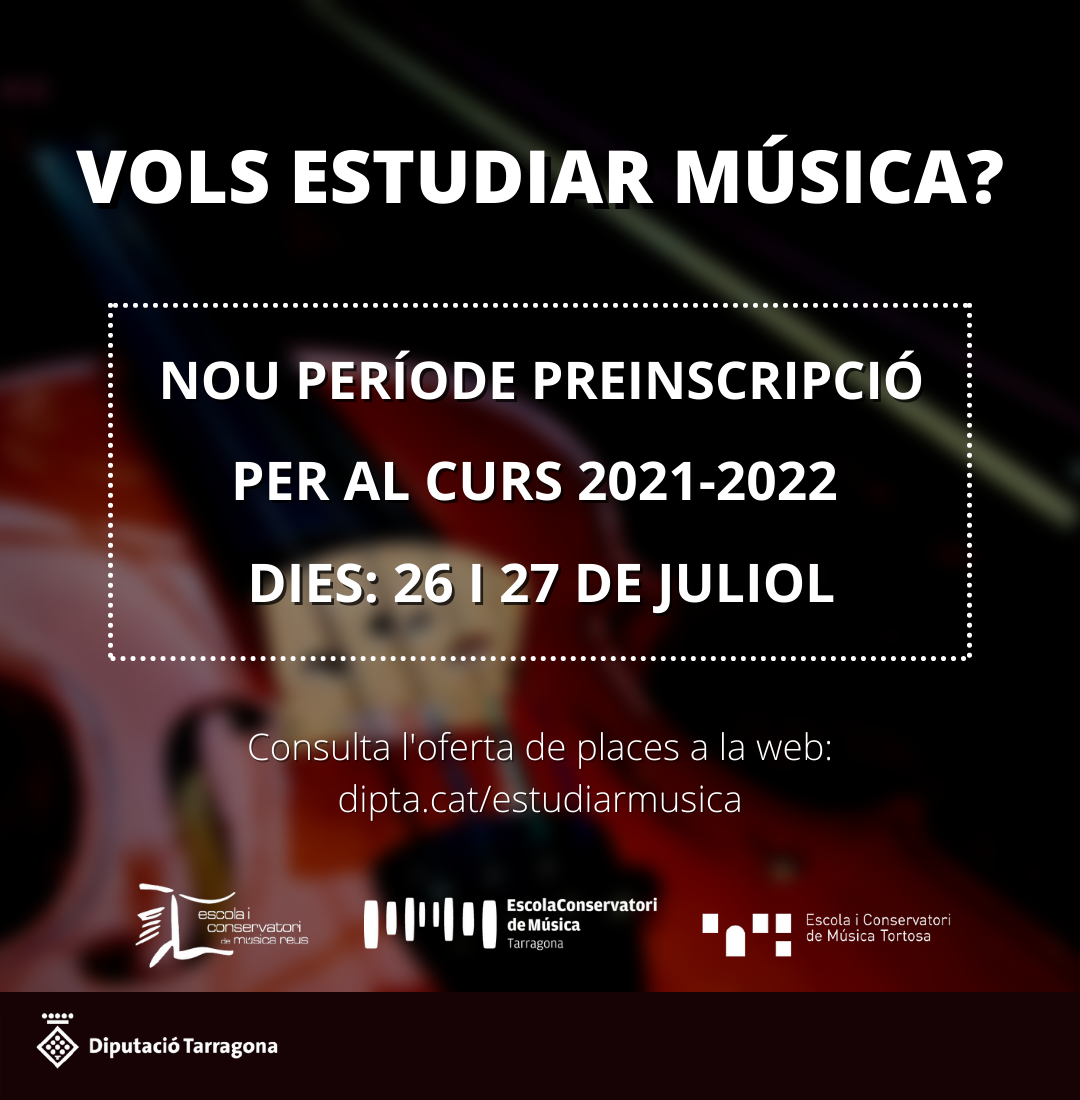 Els centres d’ensenyament musical de la Diputació a Tarragona, Reus i Tortosa obren un període extraordinari de preinscripció tant per a les escoles de música com per als estudis de grau professional. Els tràmits es podran fer els dies 26 i 27 de juliol de forma telemàtica o bé presencial demanant cita prèvia al centre. Aquesta nova convocatòria de preinscripcions està dirigida a cobrir, únicament, les places vacants de què disposa cada centre.