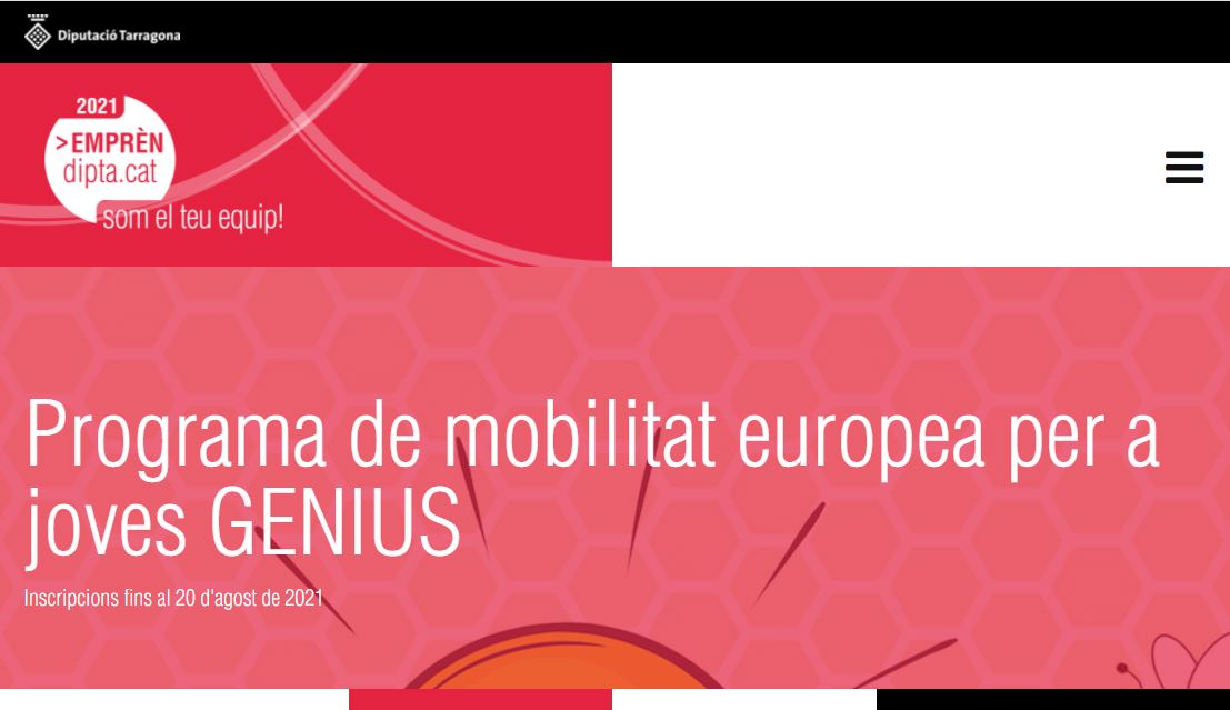 Fins al dia 20 d’agost està obert el terminis de presentació de sol·licituds per a participar en aquesta edició del Programa Genius. Trobareu tota la informació a: www.dipta.cat/empren/programa-de-mobilitat-europea-per-a-joves-genius.
