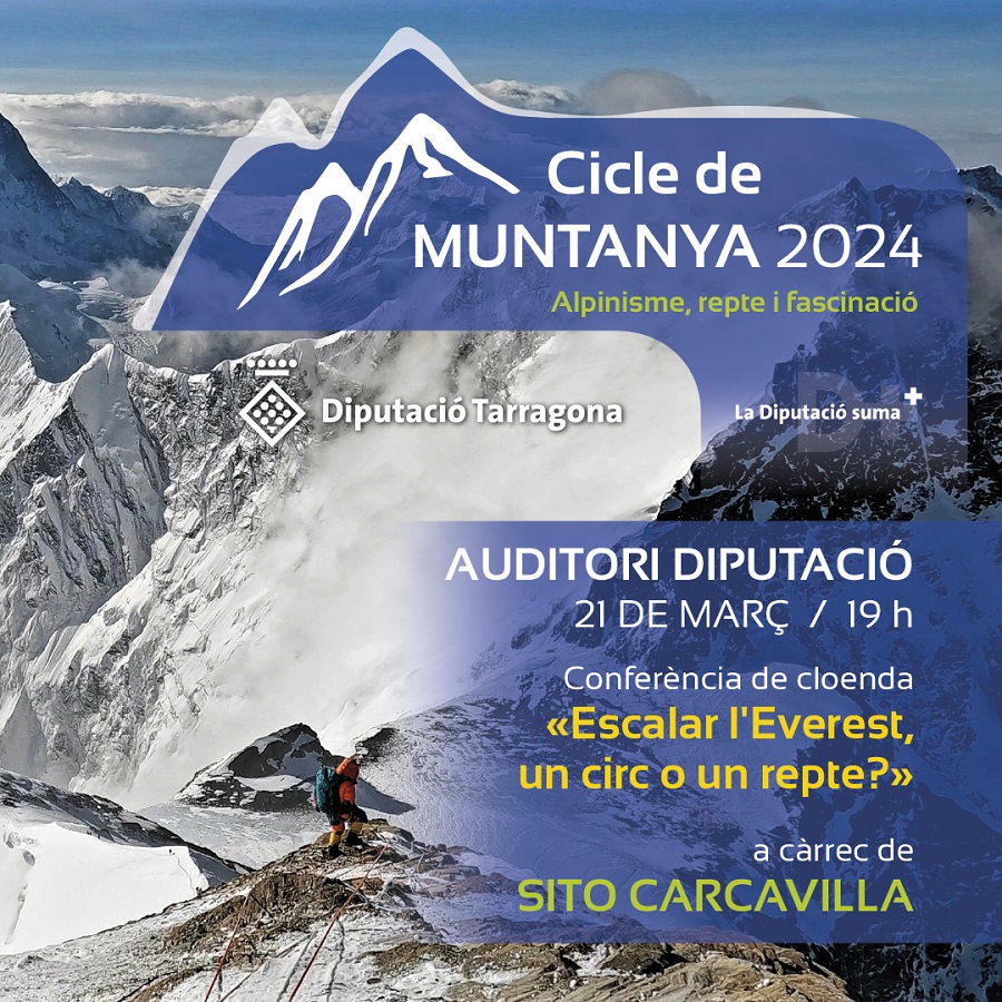 El Cicle de Muntanya 2024, organitzat per la Diputació de Tarragona, s'acomiada aquest dijous 21 de març a les 19h amb la conferència Escalar l’Everest, un circ o un repte? a càrrec de Sito Carcavilla a l'Auditori Diputació. Amb aquesta xerrada, Carcavilla, doctor en Geografia i alpinista que ha realitzat 17 ascensions a l’Himàlaia, reflexionarà sobre la massificació que pateixen aquestes muntanyes i especialment l’Everest. Exposarà la realitat de l’alpinisme de massificació superlativa i analitzarà quina és la situació actual de l’ascensió a les muntanyes de més de vuit mil metres d’altitud per les seves rutes normals. El diputat delegat de Promoció Social i Cultural de la Diputació, Óscar Sánchez, assistirà a la sessió i serà l’encarregat de fer la cloenda del cicle.