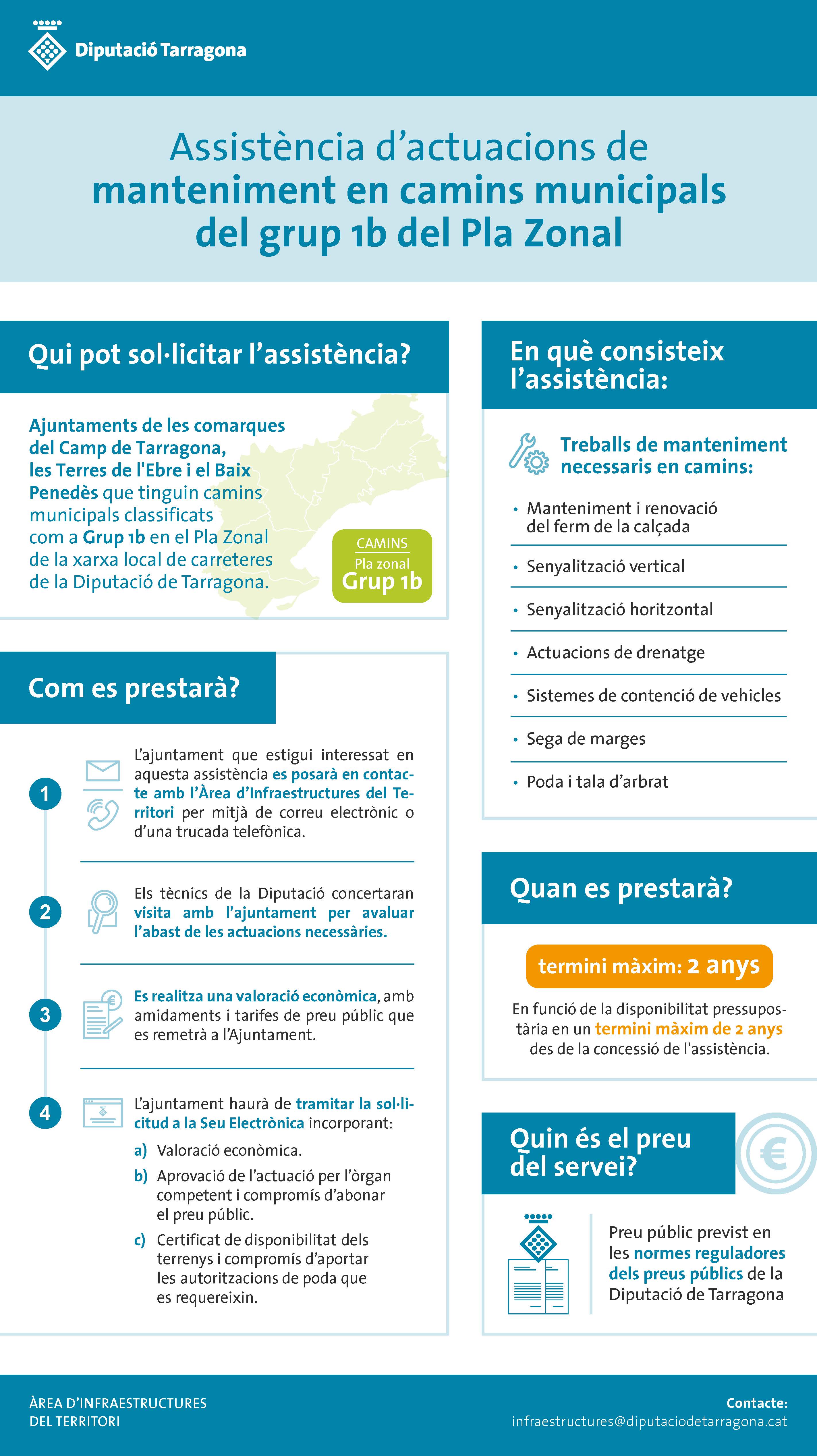 El tràmit "Sol·licitud d'assistència en actuacions de manteniment als camins del grup 1b del Pla Zonal" és el tràmit que permet als ens locals demanar assistència a la Diputació de Tarragona per a executar els treballs de manteniment necessaris per a garantir la seguretat viària dels camins del grup 1b del Pla Zonal de la xarxa local de carreteres de la Diputació de Tarragona. Per informació detallada del servei d'assistència al qual pertany el tràmit, consultar la Guia de serveis als ens locals del web de la Diputació de Tarragona" i enllaç a https://www.dipta.cat/