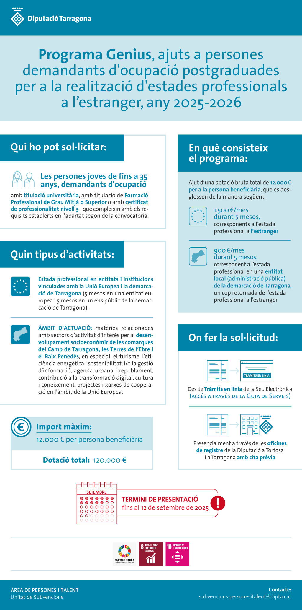 - Concedir els ajuts a persones demandants d'ocupació per a la realització d'estades professionals a l'estranger, any 2025-2026 (Programa Genius).