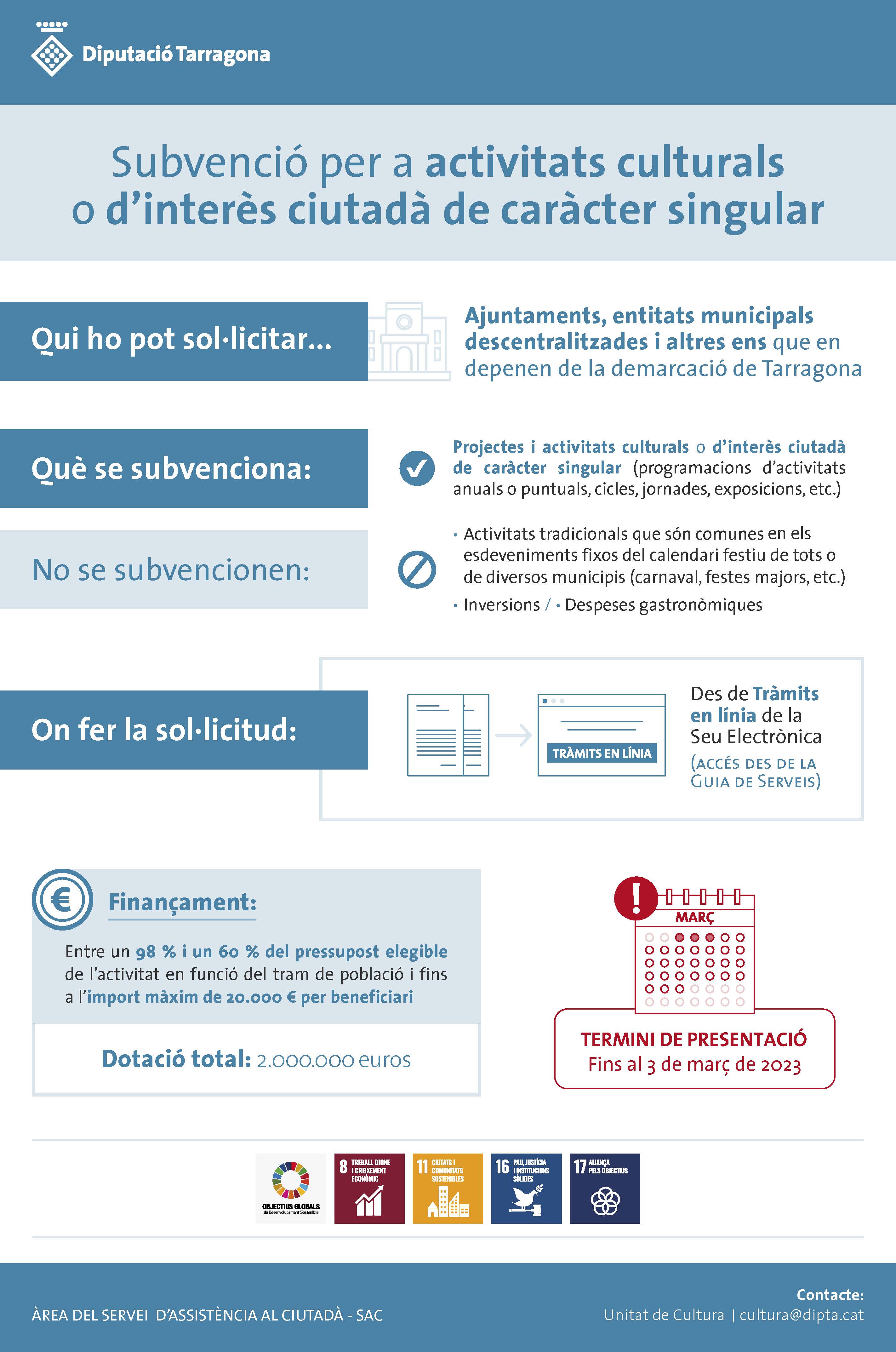 S’hi admeten totes aquelles activitats o projectes realitzats a la demarcació de Tarragona que són d’interès cultural, esportiu, educatiu, econòmic o humanitari, ja siguin programacions d’activitats anuals o puntuals o bé cicles, jornades, exposicions o similars.