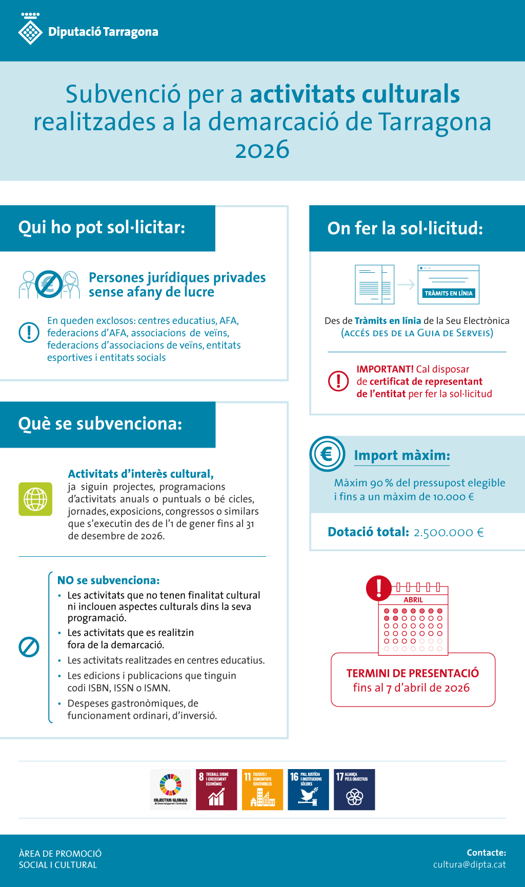 - Aprovació del reconeixement de l'obligació corresponent al pagament anticipat del 50% de les subvencions concedides en el marc de la convocatòria de subvencions destinades a persones jurídiques privades sense ànim de lucre per a la realització d'activitats culturals o d'interès ciutadà de caràcter singular a la demarcació de Tarragona (any 2025). Convocatòria pluriennal.