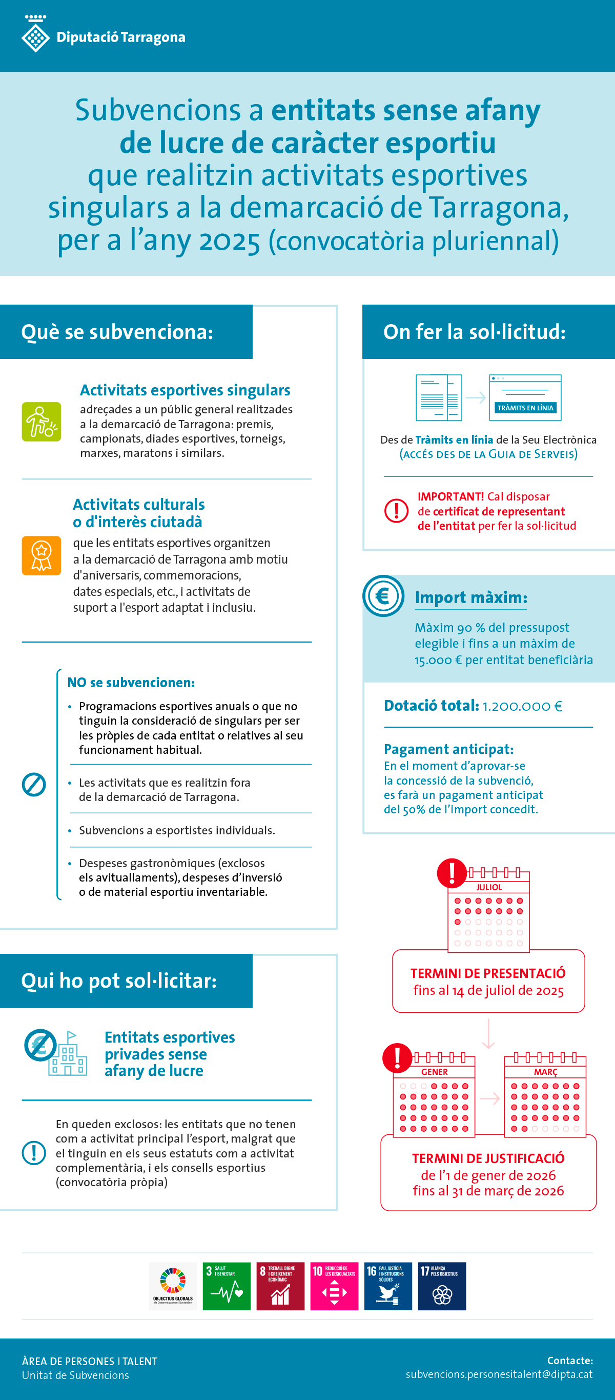 - Pagament anticipat del 50% de les subvencions concedides en el marc de la convocatòria de subvencions destinades a entitats esportives sense afany de lucre que realitzin activitats esportives de caràcter singular a la demarcació de Tarragona (any 2025). Convocatòria pluriennal