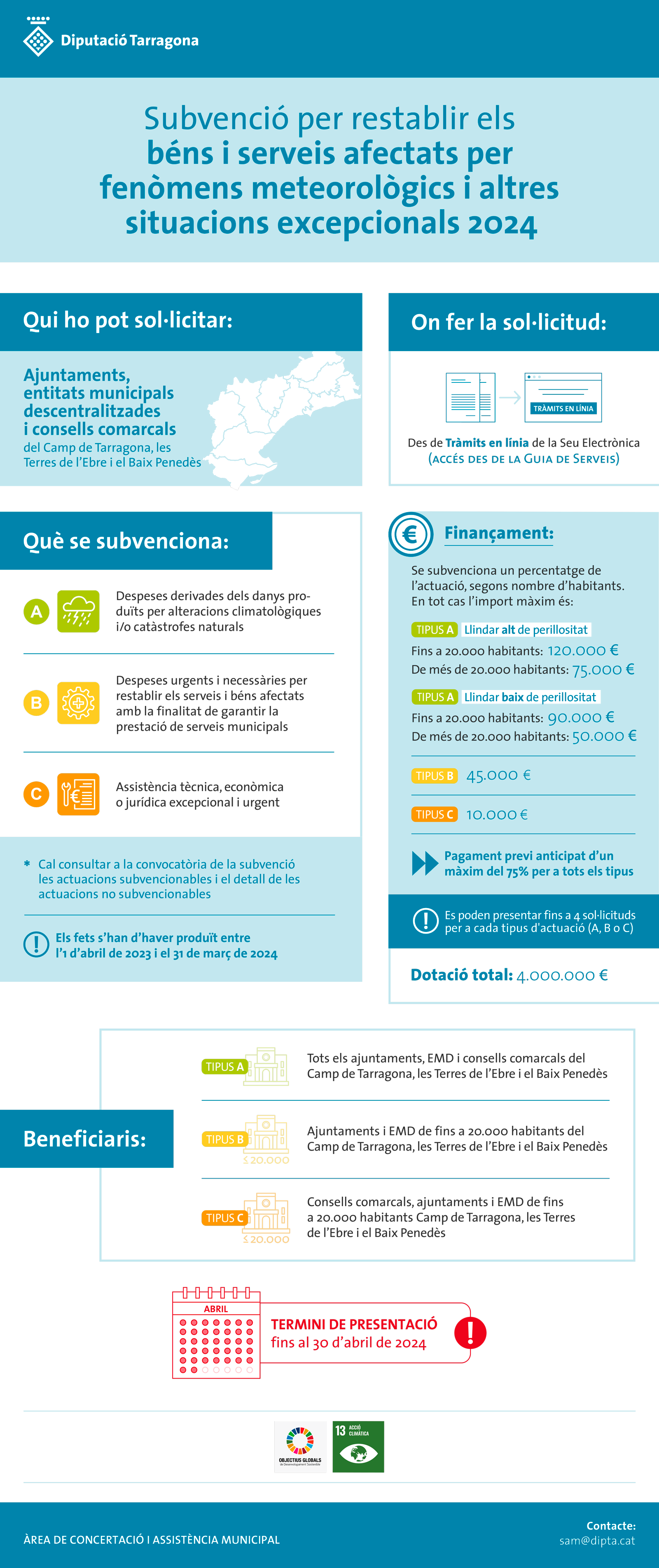 Aquests ajuts estan destinats a finançar actuacions en béns i serveis que presten els ens locals, afectats per fenòmens meteorològics o per altres causes excepcionals i urgents, amb la finalitat de garantir la prestació dels serveis de la seva competència.