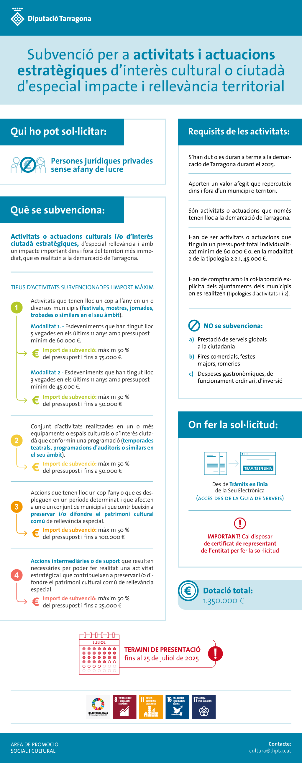 - Concessió de subvencions destinades a persones jurídiques privades sense afany de lucre per a activitats i actuacions estratègiques d’interès cultural d'especial impacte i rellevància territorial realitzades a la demarcació de Tarragona durant el 2025.